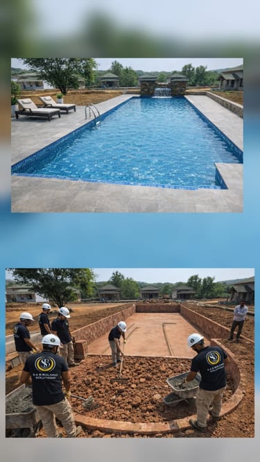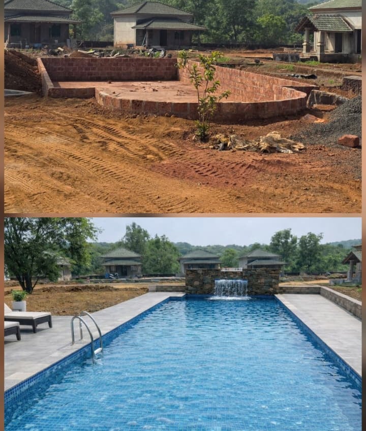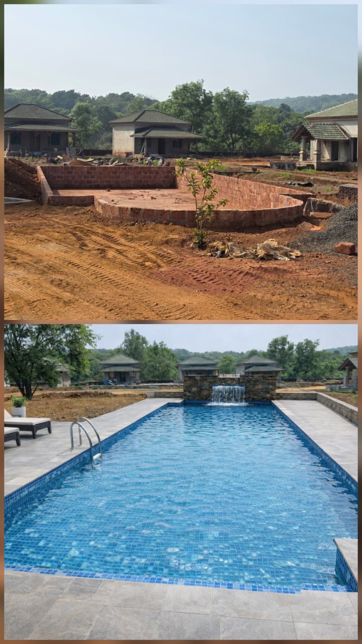 Swimming Pool construction and finishing executed for a 60×25 ft pool at Kankumbi Resort. The project features high-quality structural work, precision waterproofing, and refined finishes, delivering a durable, elegant, and resort-ready swimming pool designed for long-term performance and visual appeal.
