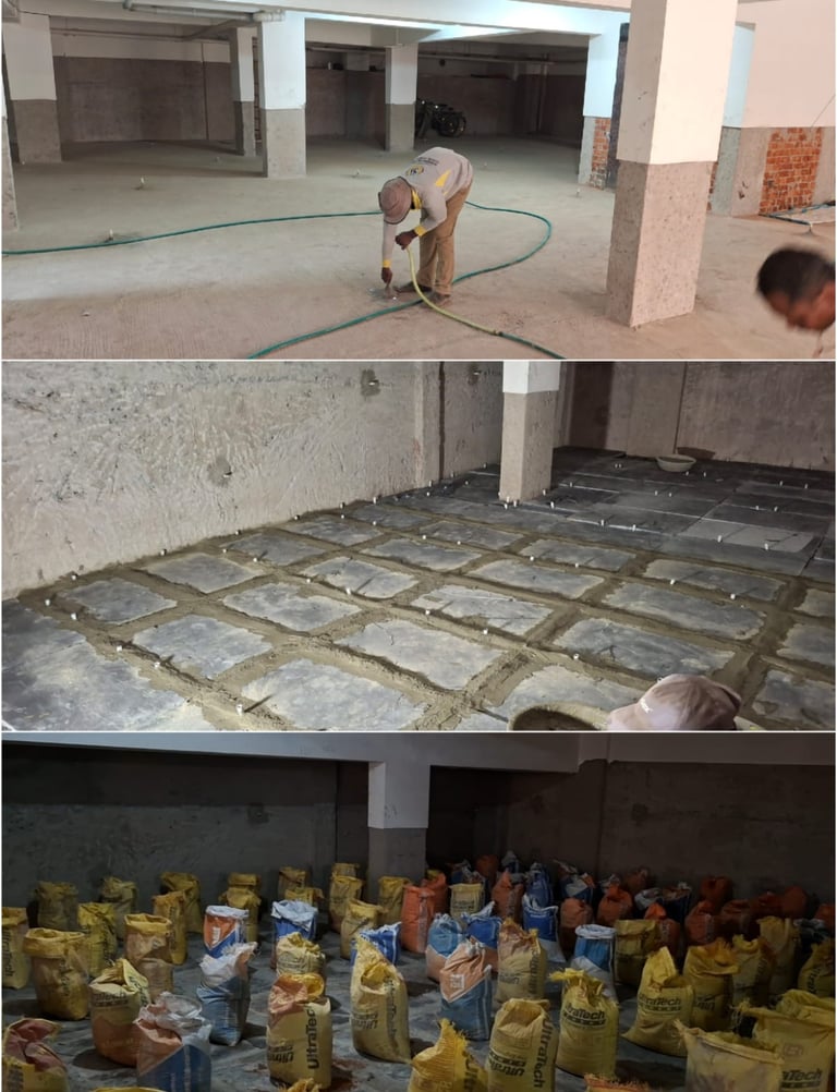 Basement waterproofing at Belagavi provided long-term protection against water damage. The project covered about 10,000 sq. ft., including surface preparation and application of a waterproofing system. Proper grouting sealed joints for durability, and a final screed layer ensured a smooth, strong surface. This guarantees a dry and secure basement environment for the apartment building.