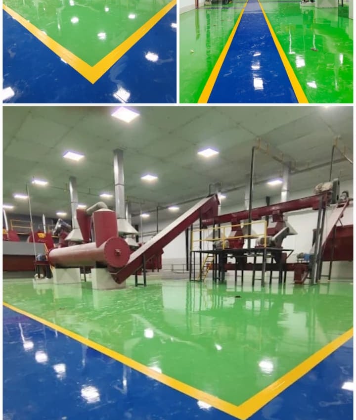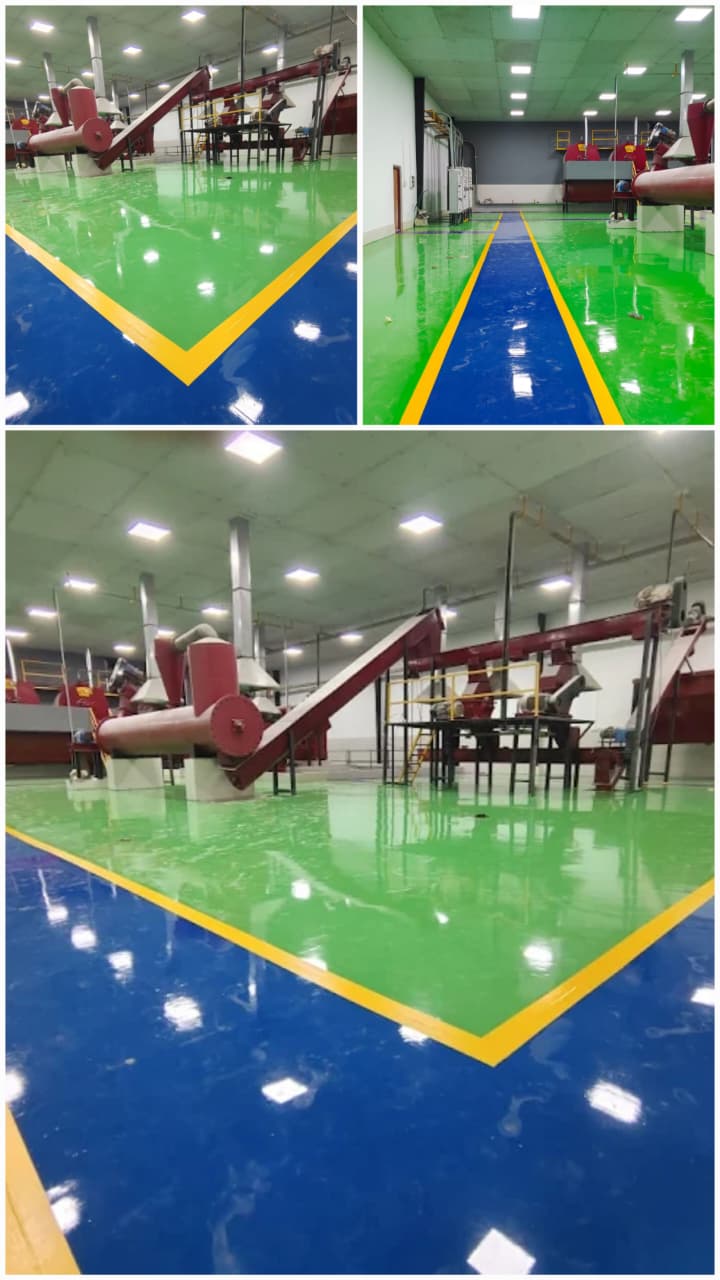 Heavy-duty food-grade epoxy flooring executed at Belgaum Proteins, designed to meet the strict hygiene and performance requirements of a waste management and food processing environment. This high-performance flooring system is built to handle heavy equipment movement while maintaining superior surface integrity.